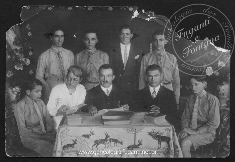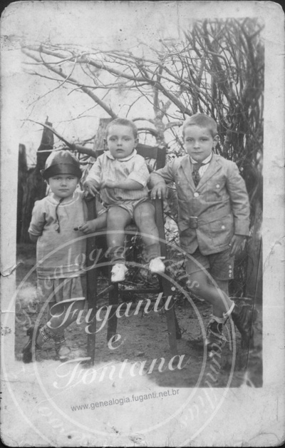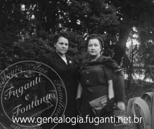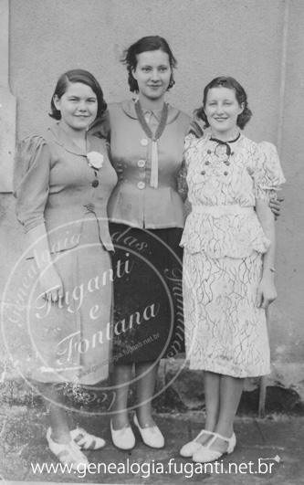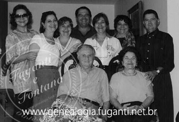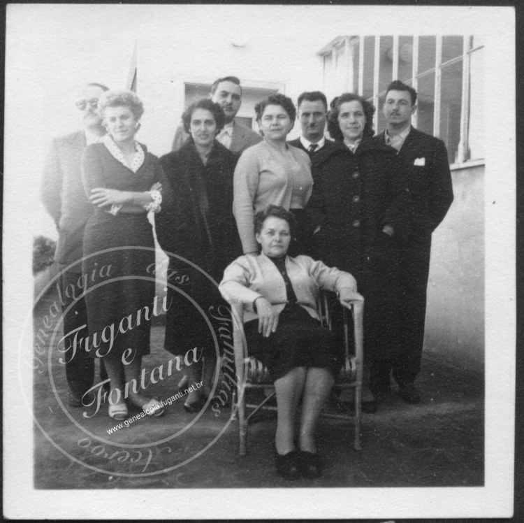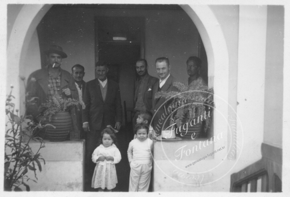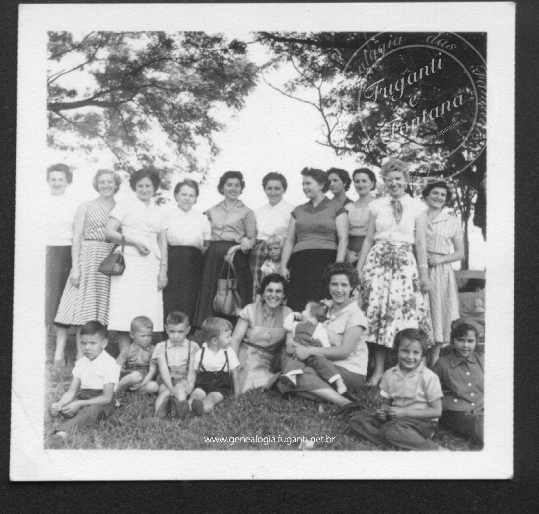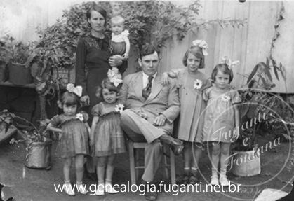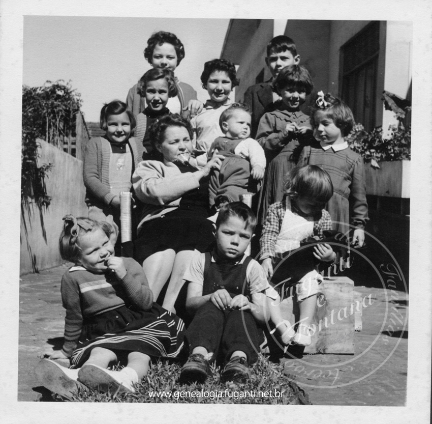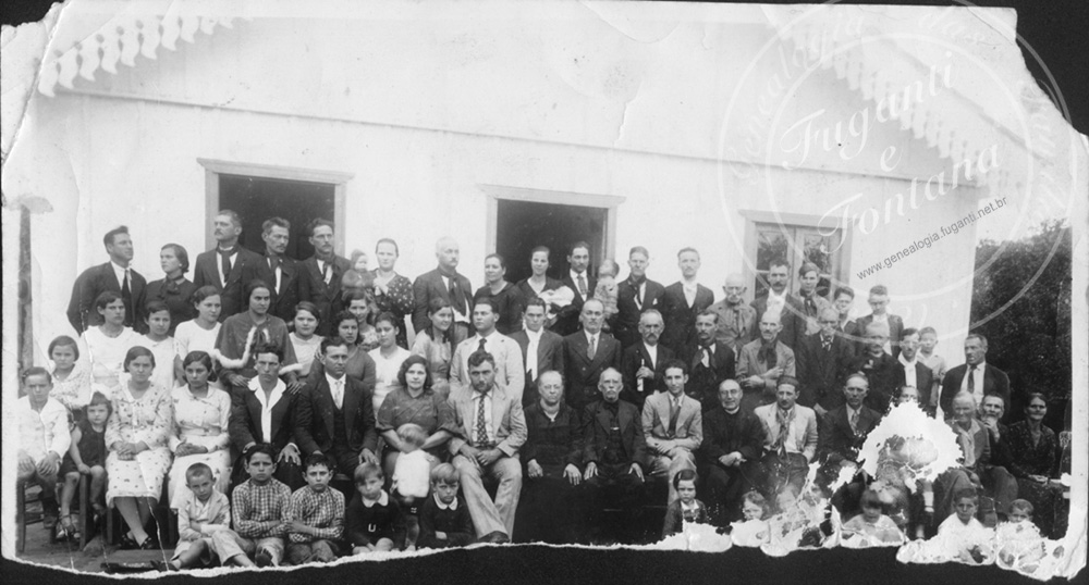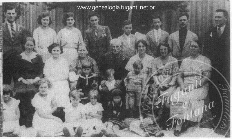 Tangará, SC, década de 1930. Joanin (João Fuganti), Delfa, Teresa, Arlindo, Victor, Guilherme Crema, Bruno Terebinto, José (Bepe) Fuganti segunda fila: Maria Buzinelo (casada com Joanin Fuganti), Anita, Carolina Andreoli, Pedro Fuganti, Albineta, Angelina Fuganti (casada com Bruno Terebinto), Angela Toglio (casada com José Fuganti), Crianças: a segunda da esquerda para a direita é a Suely, filha do Bepe e da Angela. |