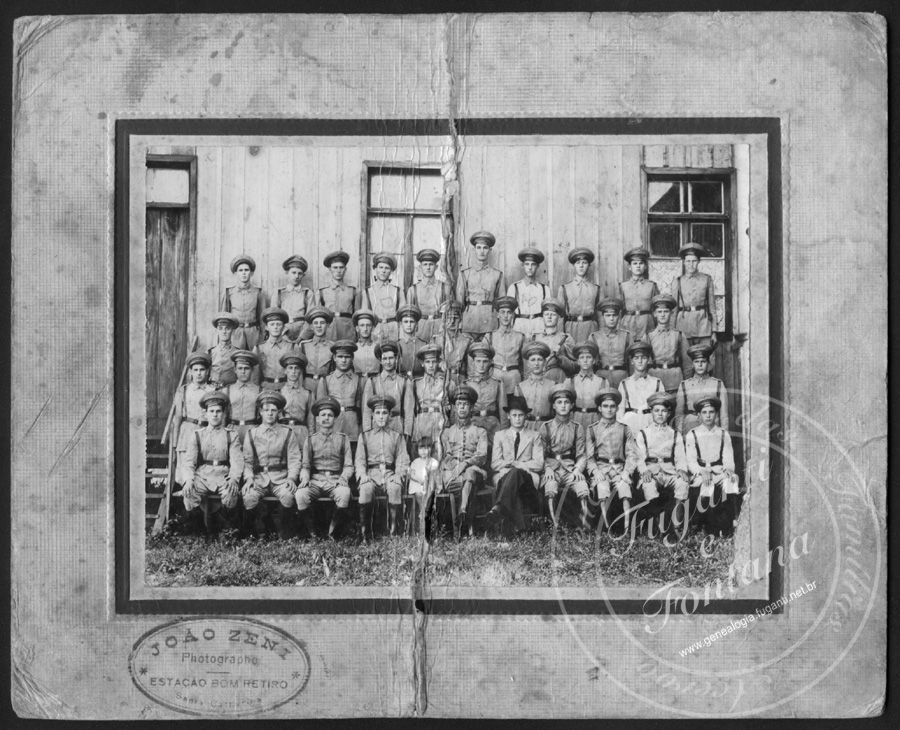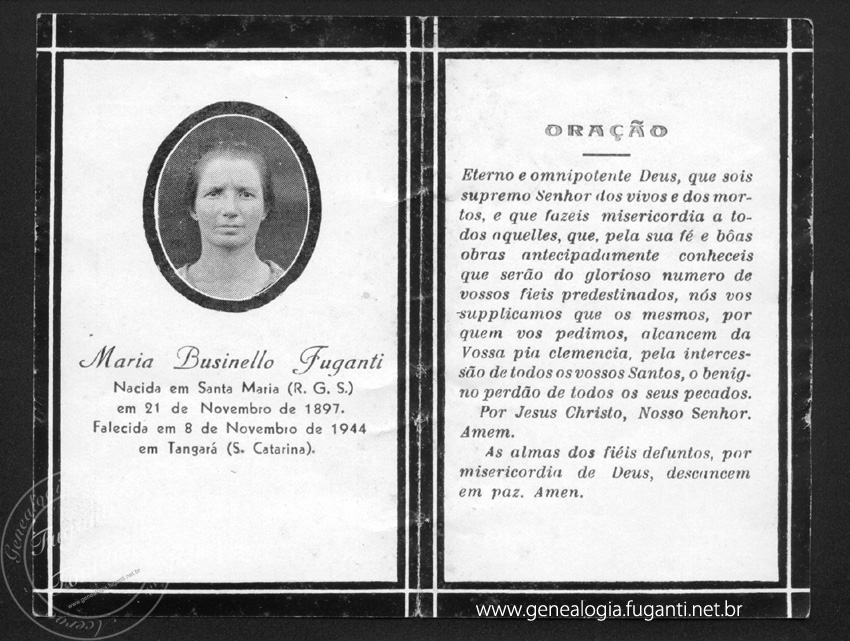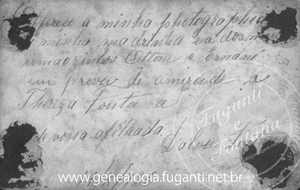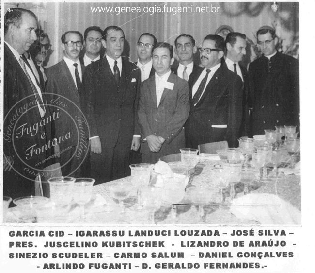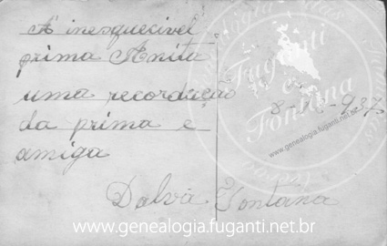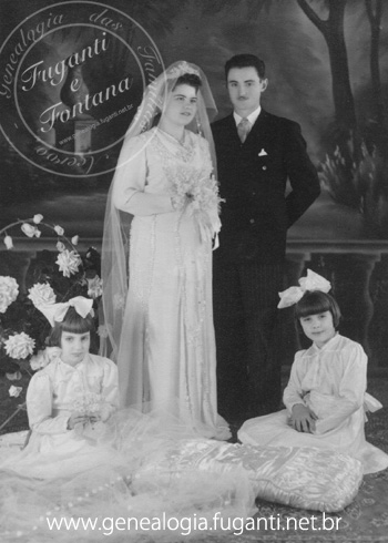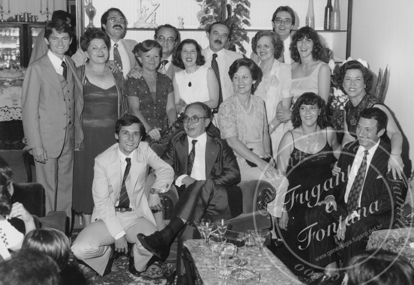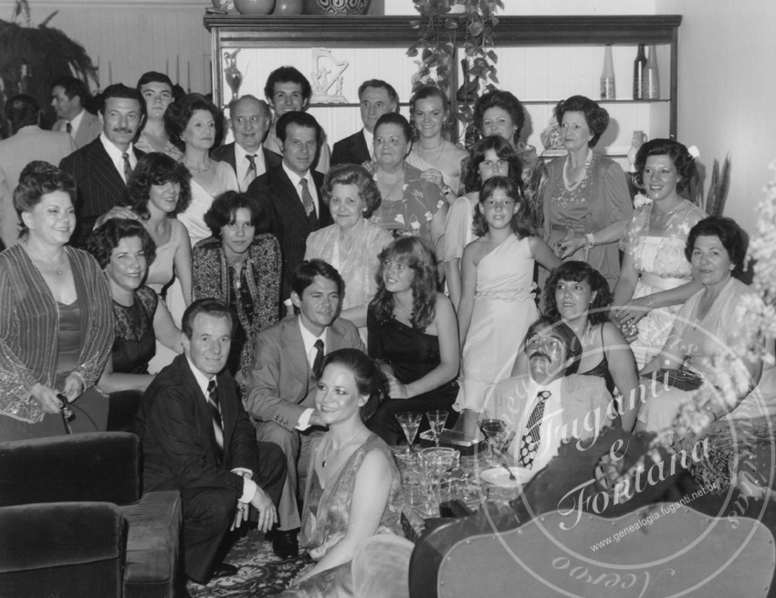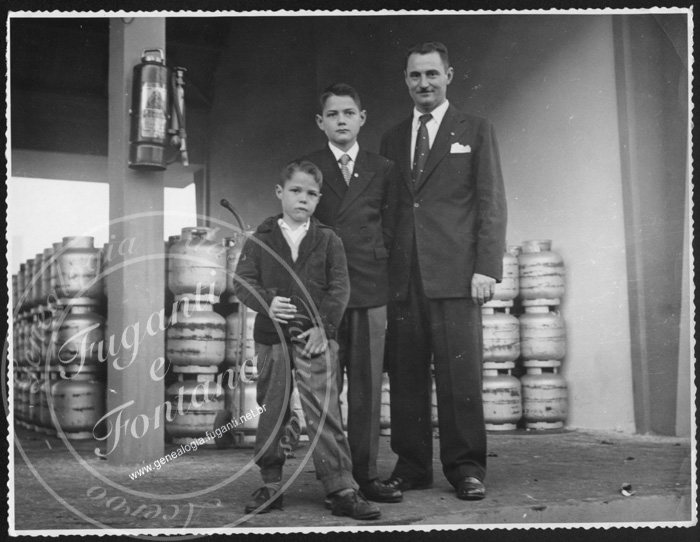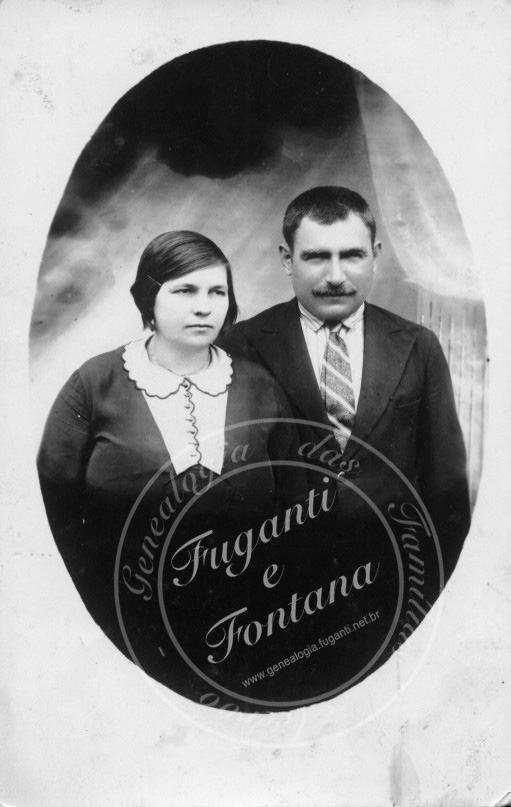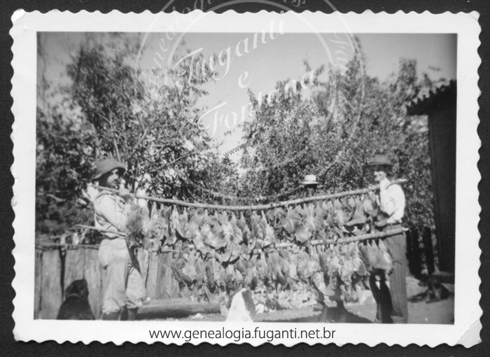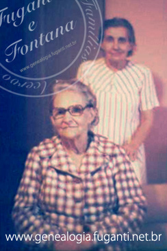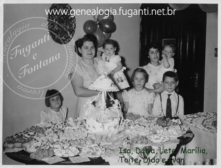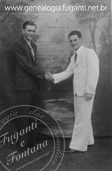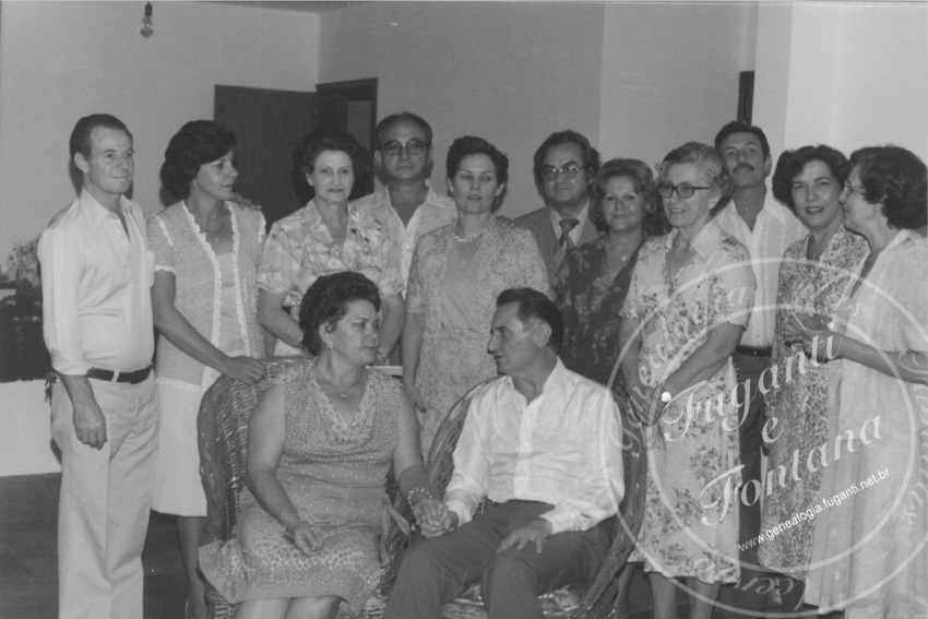 Tangará, SC, década de 1930. Joanin (João Fuganti), Delfa, Teresa, Arlindo, Victor, Guilherme Crema, Bruno Terebinto, José (Bepe) Fuganti segunda fila: Maria Buzinelo (casada com Joanin Fuganti), Anita, Carolina Andreoli, Pedro Fuganti, Albineta, Angelina Fuganti (casada com Bruno Terebinto), Angela Toglio (casada com José Fuganti), Crianças: a segunda da esquerda para a direita é a Suely, filha do Bepe e da Angela. |